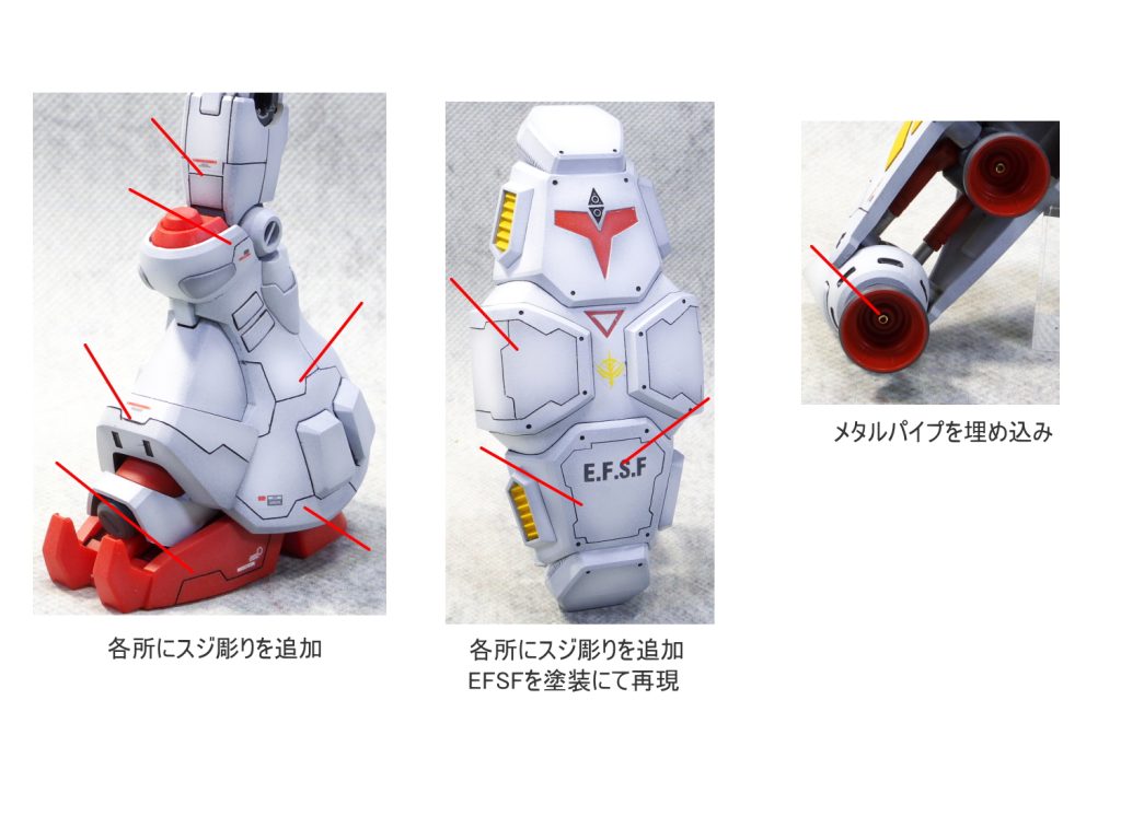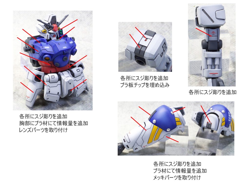 太ももをプラ板にて1mm幅増ししました。 各所にスジ彫りの追…