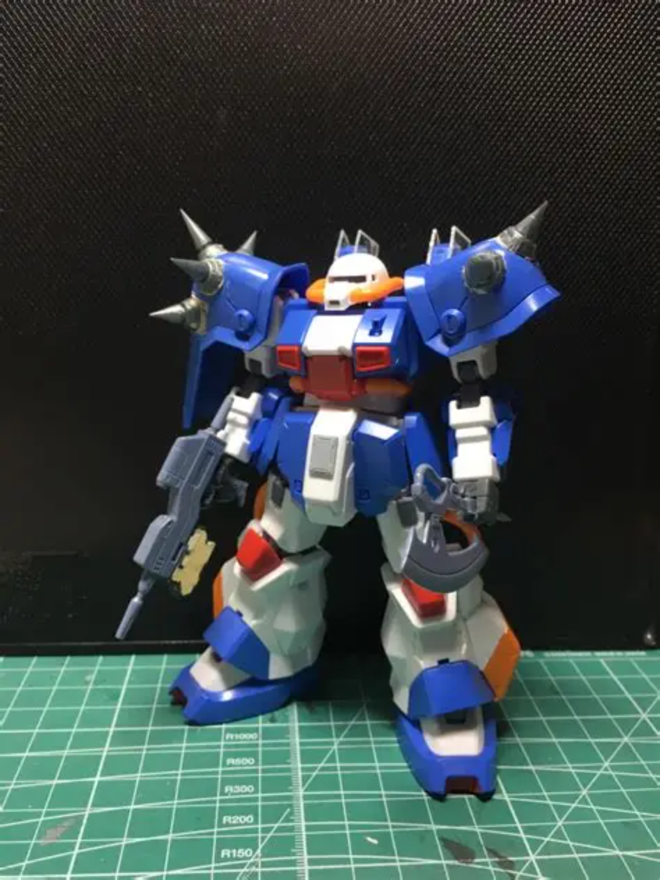 塗り分けは先行量産型の画稿や製作中に発売されたHJメカニクス18(AOZ特集号)のまつおーじさんの作例を参考にマスキングで塗り分け。きれいに仕上がったもののスパイク基部などオレンジイエローで塗る箇所の塗装やり直しが発生。ペイントリムーバーでスパイク基部の塗装剥がしていたらマスキングテープにしみるなどで肩アーマーは結局塗り分けが無駄になりましたが...