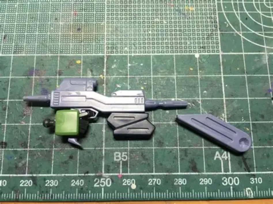 ハイザック/マラサイ用ビームライフルはキットのものとヘイズル系のEパックが換装できるように加工しました。裏をエポパテで埋め、はめ込み用の溝を作り微調整。最後は裏側をプラ板で表裏同じディテールになるようにしました。
