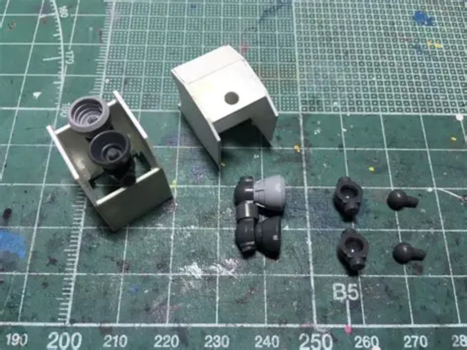 下部のスラスターはプラ板の箱組で製作しましたが、最初に作ったのが直角の精度が甘く、細身過ぎたので上下幅を抑え、角度やらサイズやらを小さめに調整してリテイク。