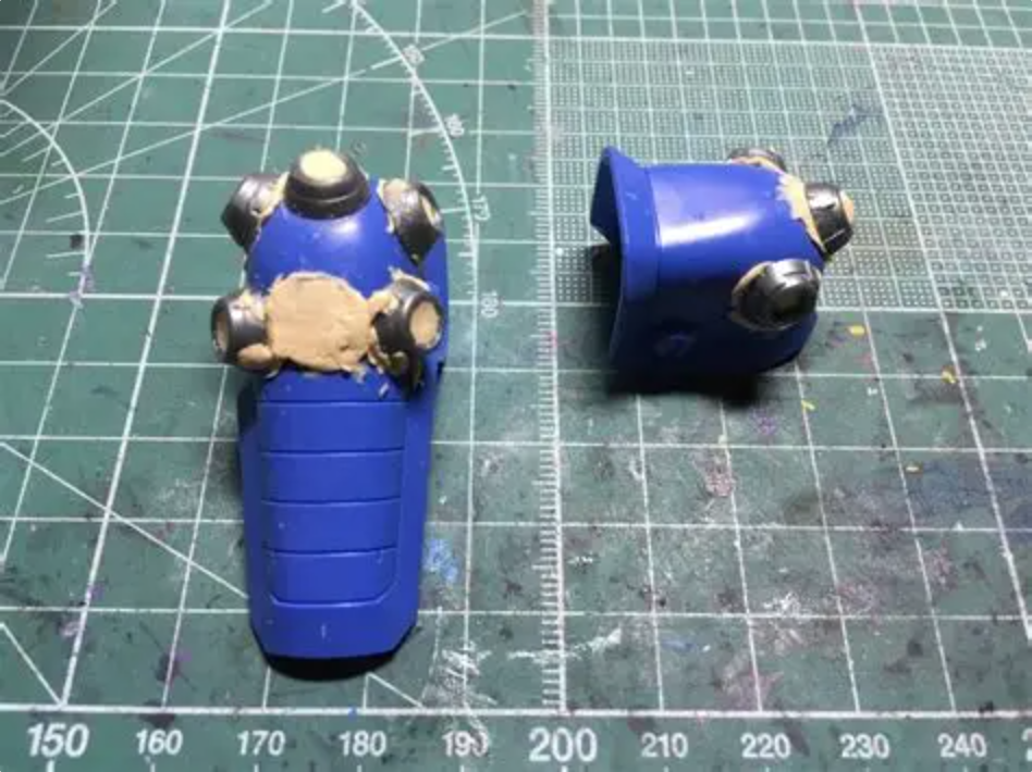ハイザック・カスタム製作は肩アーマーにビルダーズパーツHD「MSスパイク01」の基部をエポパテで接合しています。スパイク基部は塗装後につけられるようにしたかったんですがうまく剥がせず………エポパテ工作やっぱり難しいし思うようにいかないので苦手っす