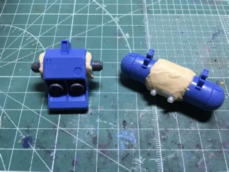 バックパックはホビーハイザックの可動式スラスターをボールデン付属のT字型ジョイントの一部を加工してプラ棒で接続。パテを節約するためにプラ棒でかさ上げしつつ隙間を埋めました。