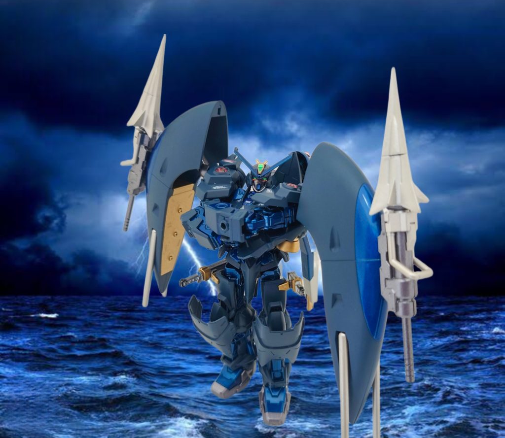アビスガンダムの特徴的な両肩部シールドをミキシングし、パイルバンカーを追加で装備させてみました。水中戦闘では銛のように発射する設定です。