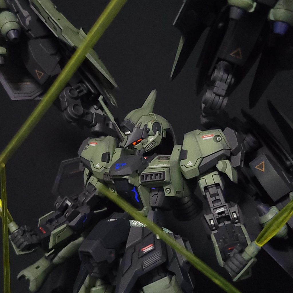 ミキシングの巧みさにジオンカラーの重厚感が見事にマッチしていて、完成度の高さに圧倒されました……カメラアイやバインダーの番号など随所に見えるこだわりも凄い好みです。完成おめでとうございます。