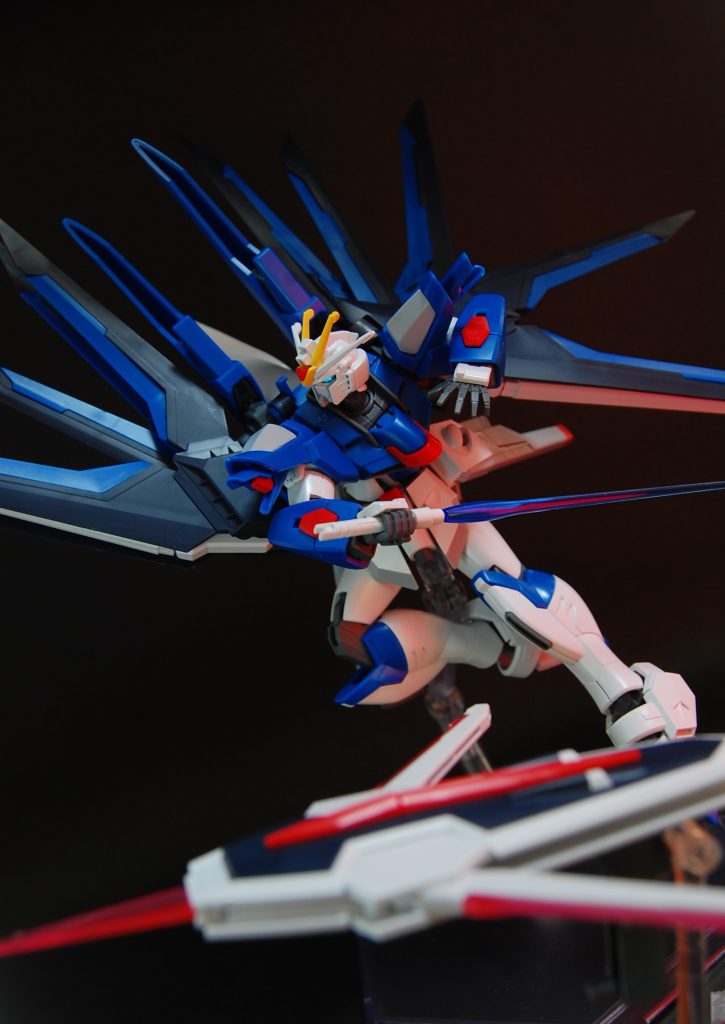 フリーダムの羽は黄色系のライティングが合う気がしますね。無印SEEDでアスランと和解した時の夕日にあたった羽の色みたいに、ライティングで羽を青緑に見せるのも綺麗だと思います。
