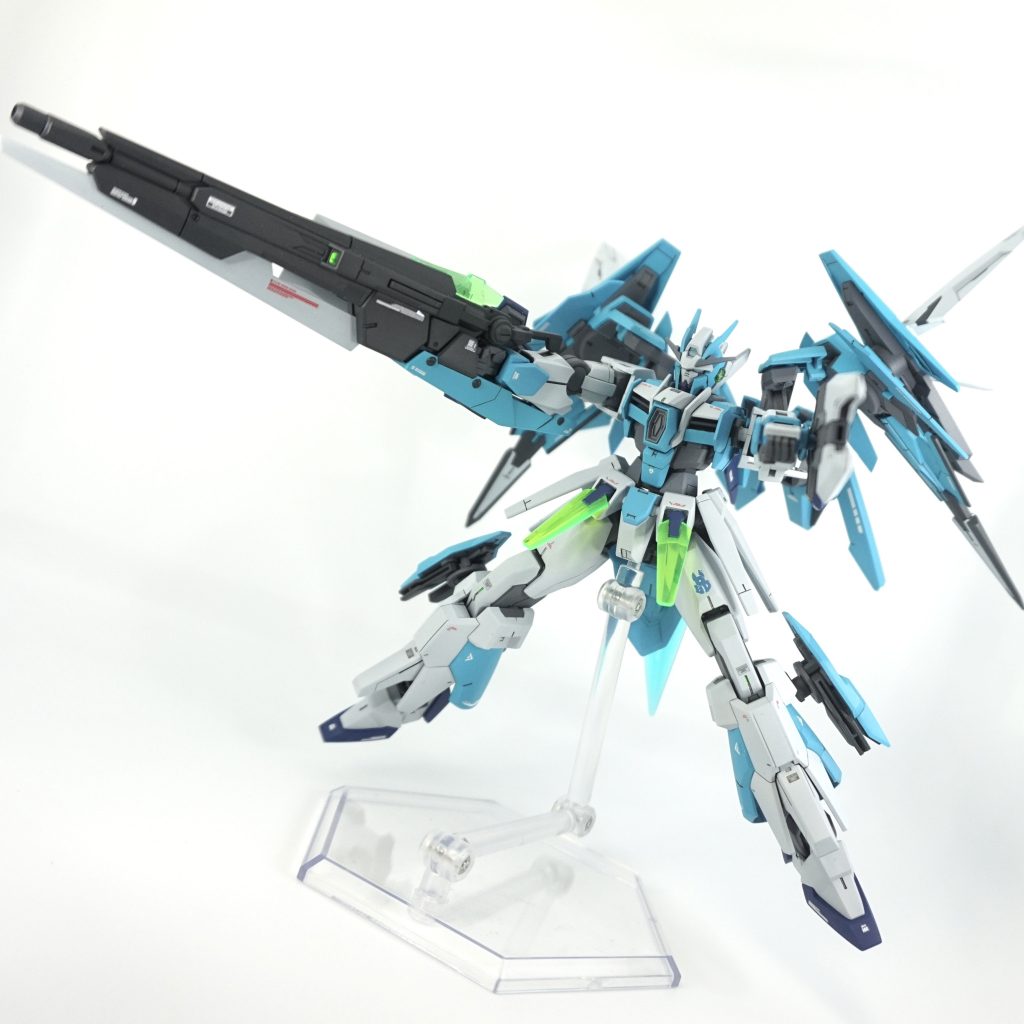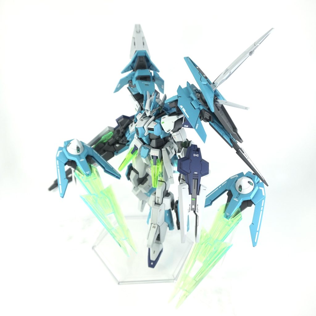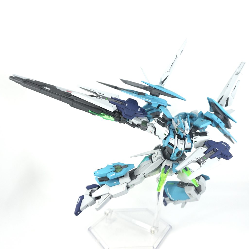 HG1/144 ガンダムダブルオーダイバーアークをベースにFXやスカイなどミキシングしてオリジナルダブルオー機体に仕上げました。カラーは、ブルーを変更し気になっていたクレオスのMr.カラー浅葱色に挑戦して爽やかな色にしてみました。
