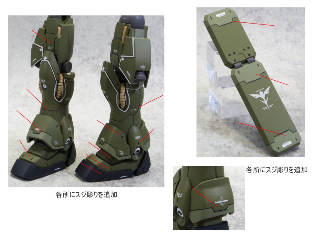 太ももをプラ板にて1mm幅増ししました。 各所にスジ彫りの追…