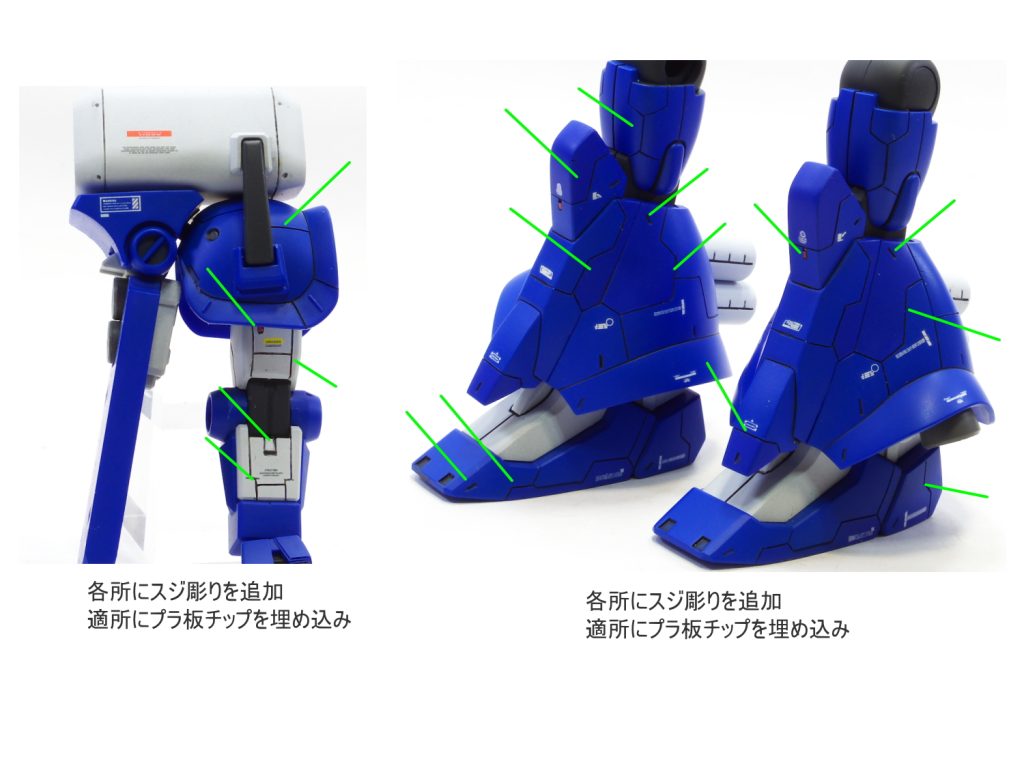 各所にスジボリにて情報量を追加して塗分け 太ももをパテにて幅…