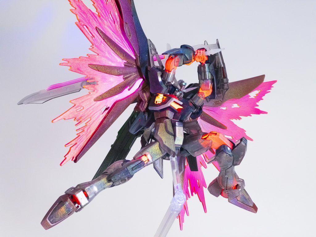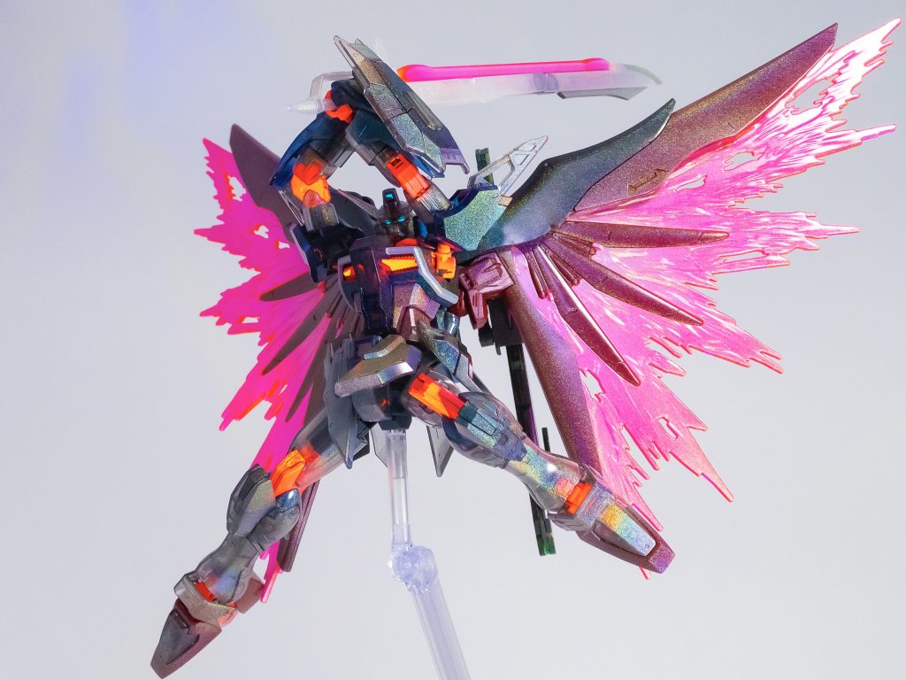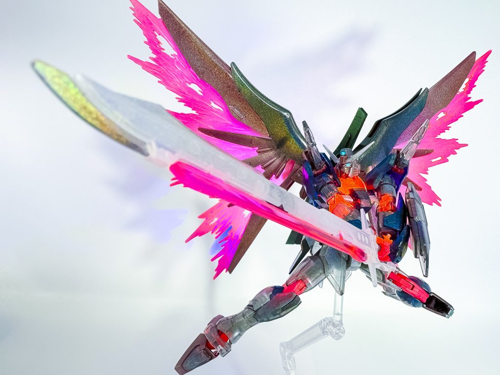 関節部と光の翼は蛍光塗料で塗装したのでUVライトで発光が楽しめます。