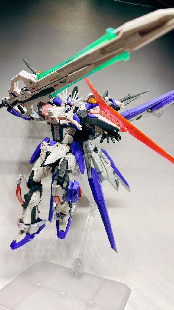 ライフルはエクシードギャラクシーのものにパーフェクトストライクフリーダムで余るストライクフリーダムのライフル上部のカバー?を短縮してエクシードギャラクシーのウイングを接着して取り回ししやすいショートライフルに。