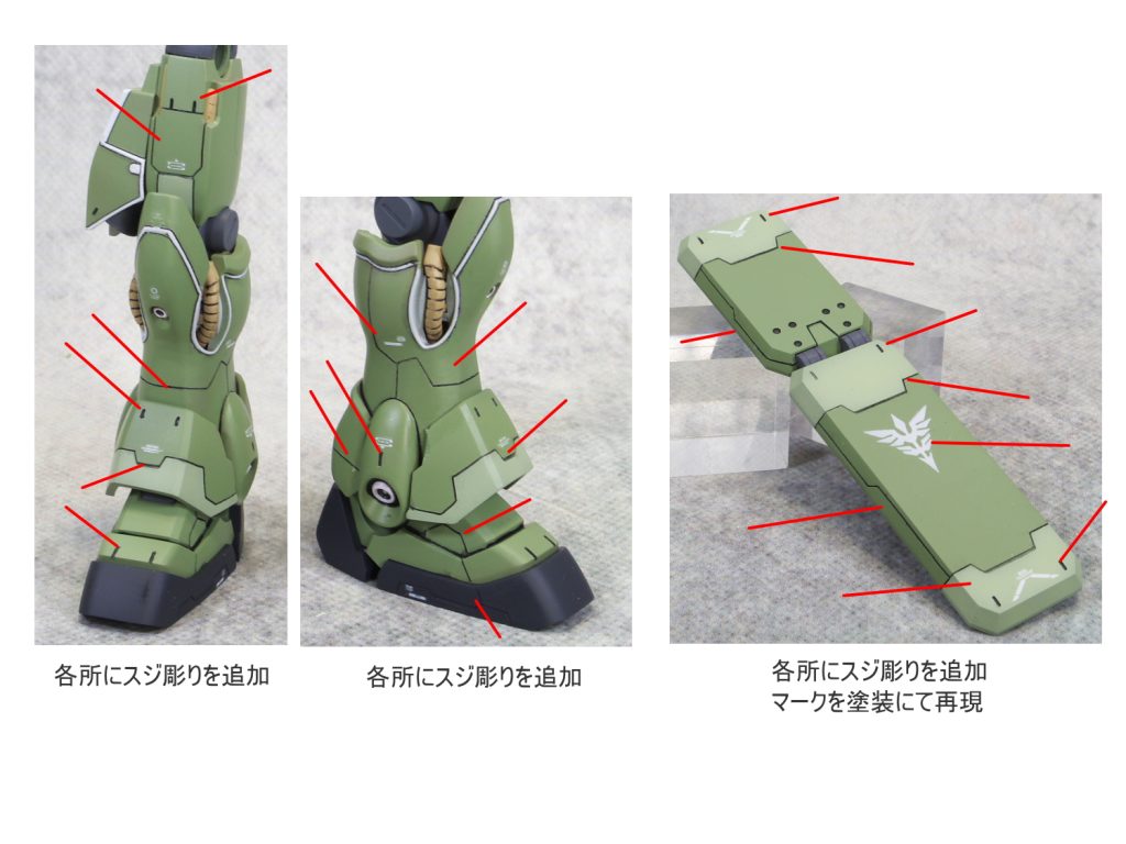 各所にスジボリにて情報量を追加して塗分け 太ももをパテにて幅…