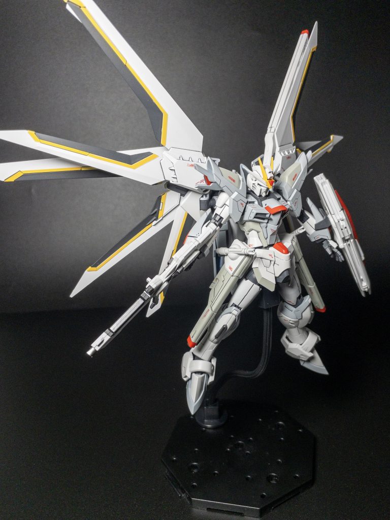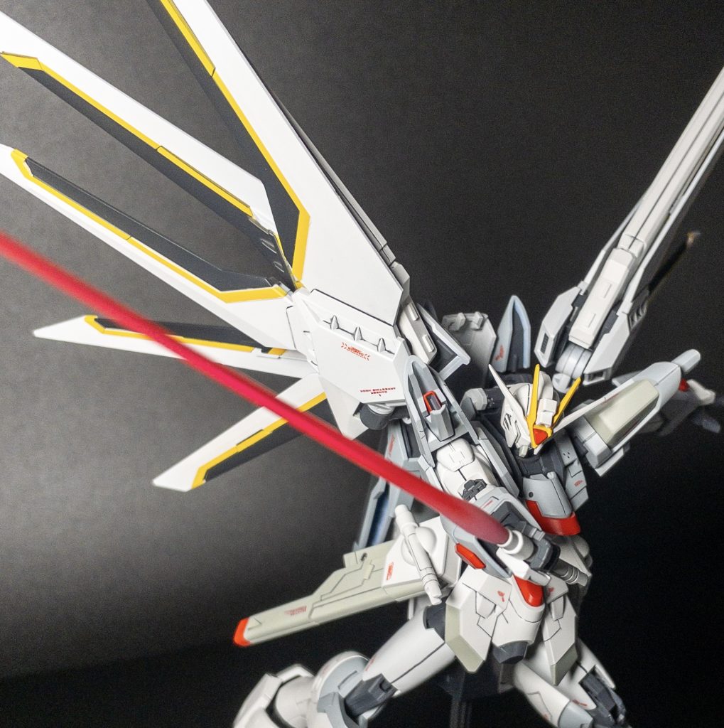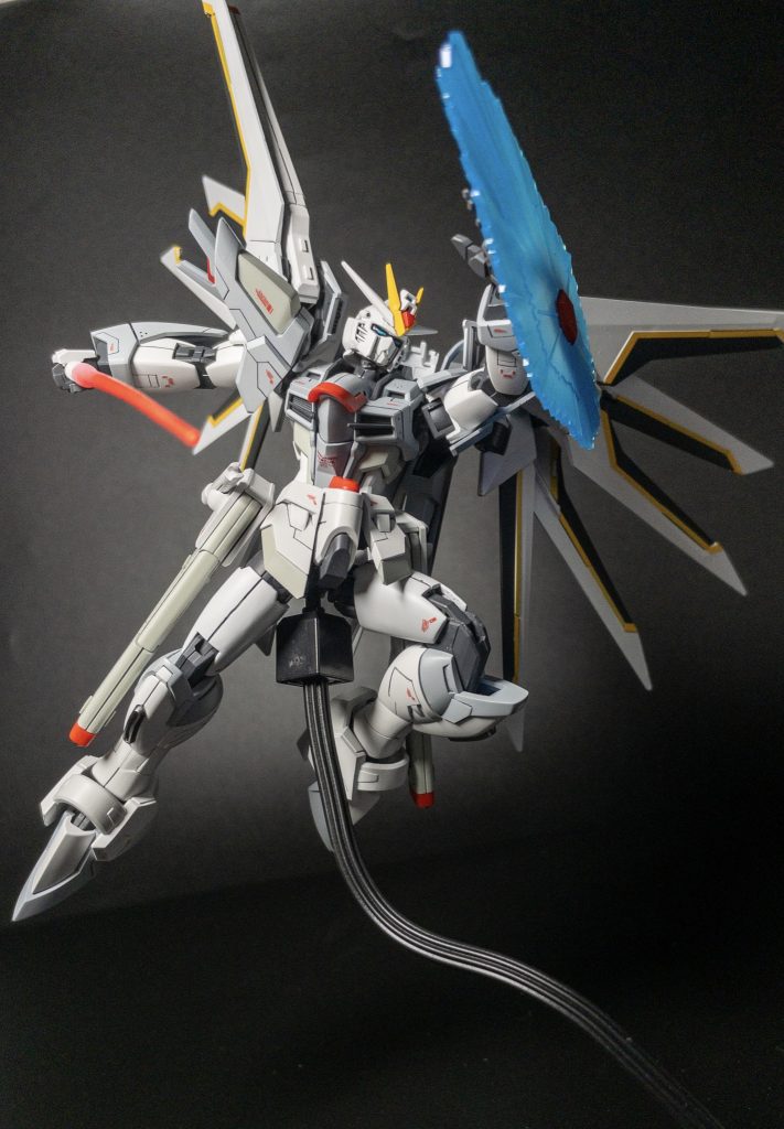 ブルーの部分をホワイトとグレーで塗装したことにより通常のフリーダムとはイメージを大きく変化できたと思います。羽の部分のマスキングなど大変でしたがやりきると達成感ありますね!ウイング部や腹部の関節にバンダイの最新技術を感じられる良キットだと思います。