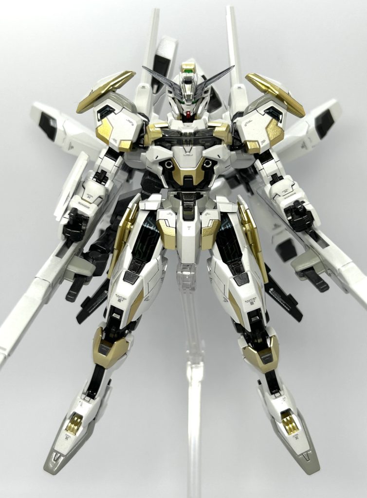 キャリバーンやっとできました!バリアブルロッドライフルを2基使った贅沢仕様です。白い機体のイメージを壊さない程度にホワイトゴールドとライトグレーを入れ、落ち着いた雰囲気に纏めました😊