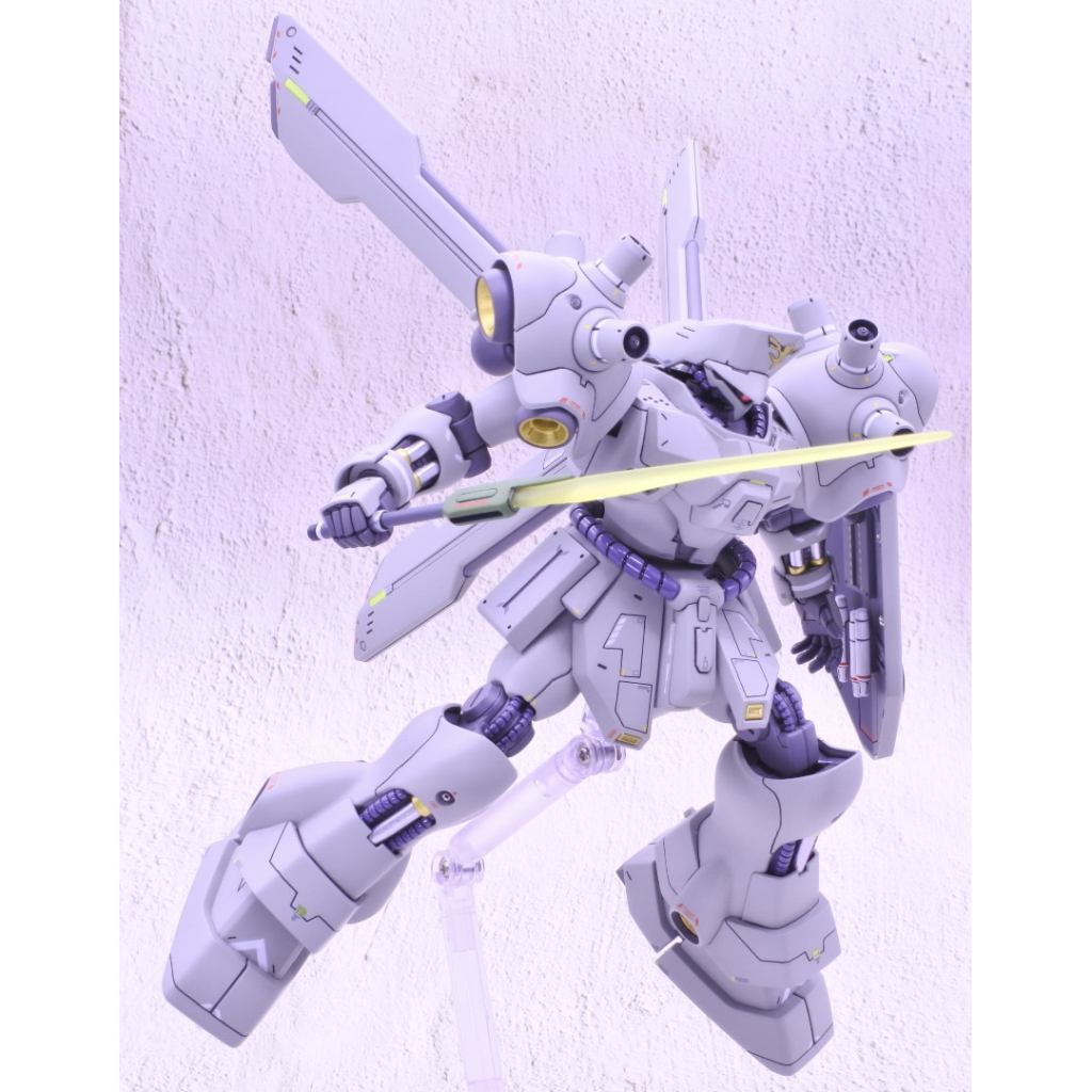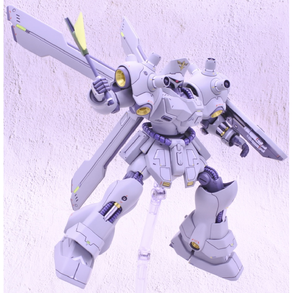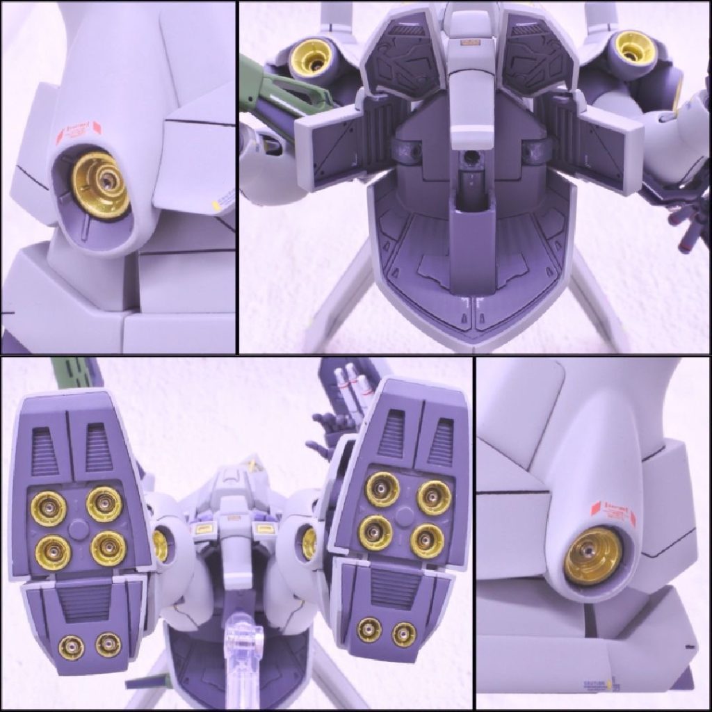 ![[頭部]・合わせ目消し、スジボリ追加。・フェイスパーツの造形をコミック版のデザインに変更し、特徴的なクチバシを再現。額のエンブレムは後ハメ加工。・モノアイパーツは開口し、蛍光ピンク裏打ちのHアイズクリア1.5mmを取り付け。・頭頂部のモールドに蛍光イエロー裏打ちの自作クリアパーツを取り付け。[胸部]・スジボリ追加、パーツの分割線は段落ちモールド化。・中央ブロックにプラ板でハッチディテールを追加、蛍光イエロー裏打ちの自作クリアパーツを取り付け。・首パーツと腕部接続パーツはSSPで肉抜き穴埋め。[腰部]・スジボリ追加、プラ板でハッチディテールを追加。・フロント、リアアーマー裏の押出ピン跡にプラ板を取り付け。・サイドアーマー裏はプラ板とモールドプレートで裏打ち。[腕部]・既存モールド彫り直し。・肩に蛍光イエロー裏打ちの自作クリアパーツを取り付け。・バーニアは基部のボールジョイントを開口しHi-Qガンマズルショート1.3mm取り付け。・アポジモーターは開口しHi-Qガンマズルショート1.0mm取り付け。・ファンネル接続部中央にプラパイプ3.0mmを仕込み、クリアプラ棒2.0mmを差し込めるよう加工。・プラパイプ3.0mmの先端にHi-Qマイナスパイル3.0mmを取り付け、右腕のシールド接続穴を閉塞。[バックパック]・スジボリ追加、既存モールド彫り直し、プラ板でハッチディテール追加。・背部センサーは蛍光ピンク裏打ちのHアイズ4クリア角2.0mmを取り付け。・側面のマイナスモールドディテールを削り取って開口し、Hi-Qマイナスパイル1.0mmを取り付け。[バインダー]・スジボリ追加。・三角形の噴射口を開口し、内部にモールドプレート取り付け。・両サイドにモールドプレートと蛍光イエロー裏打ちの自作クリアパーツを取り付け。・下向きバインダーの基部パーツはSSPで肉抜き穴埋め。[脚部]・スジボリ追加、膝と裾後部の合わせ目消し、脛のシリンダーパーツは後ハメ加工。・裾の前後に蛍光イエロー裏打ちの自作クリアパーツを取り付け。・つま先の分割モールドをSSPで埋めて形状変更。・膝のアポジモータ、裾側面と足裏のバーニアにHi-Qツインパイプ1.5mm取り付け。[ビームアサルトライフル]・既存モールド彫り直し。・銃口にHi-Qツインパイプ1.5mmを取り付け。[ギラドーガ指揮官機用ビームライフル]・合わせ目消し。・銃口にHi-Qツインパイプ2.0mm取り付け。・前方センサー部分に蛍光ピンク裏打ちのHアイズクリア1.5mm、蛍光グリーン裏打ちの自作クリアパーツを取り付け。[ビームソードアックス]・既存モールド彫り直し。・伸長状態のビーム刃発生部を開口し、サーベルを取り付け可能に。[ファンネル]・銃口にHi-Qガンマズルショート1.0mm取り付け・展開時のカバー付け根補強部分を削り取り、下部の三角形モールドも切り取り。・展開時の噴射口にプラパイプ3.0mmを仕込み、クリアプラ棒2.0mmを差し込めるよう加工。[シールド]・スジボリ追加、既存モールド彫り直し。・プラ板で追加装甲ディテールを追加し、丸モールドの位置で開口してHi-Qマイナスパイル2.0mm取り付け。・グレネード弾頭はプラパイプ3.0mmで大型化。・腕部接続パーツは下側接続ピンを切り取り、Hi-Qマイナスパイル3.0mm取り付け。[塗装]・本体、シールド表:ガルグレー・内部フレーム:グレーバイオレット・動力パイプ:調色グレー(ニュートラルグレー、パープル)・エンブレム、バーニア内部:スターブライトブラス・シリンダー:スターブライトシルバー、スターブライトブラス・ライフル、ビームソードアックス:調色グリーン(ルマングリーン、RLM82ライトグリーン)、ファントムグレー、MSグレージオン系、スターブライトシルバー・シールド裏:MSグレージオン系・ファンネル:銃口側はファントムグレー、噴射口側はMSグレージオン系・ファンネル用クリア棒:蛍光ブルー・トップコート:スーパースムースクリア、スーパークリアーⅢ[デカール]・ガンダムデカール、クラウドイレブン、ベルテクス等のデカールをアクセント程度に使用。](https://gumpla.jp/wp-content/uploads/2024/03/IMG_0821-1024x1024.jpeg)