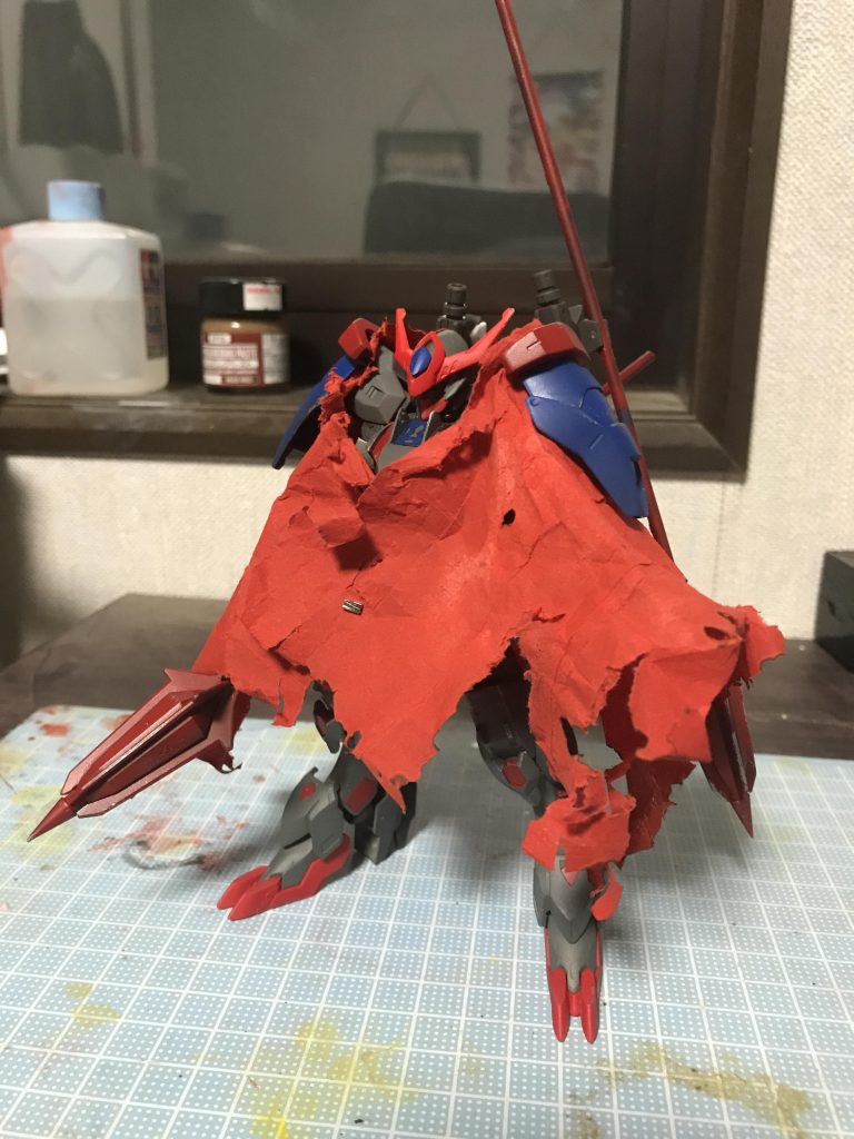 第1のロマン、二本一対の深紅のツインランスメイス、背中から現れるツインショートライフルです。そして第2のロマン、ティッシュを赤く染めお線香で端を焦がして作ったボロマントを纏わせてみました!