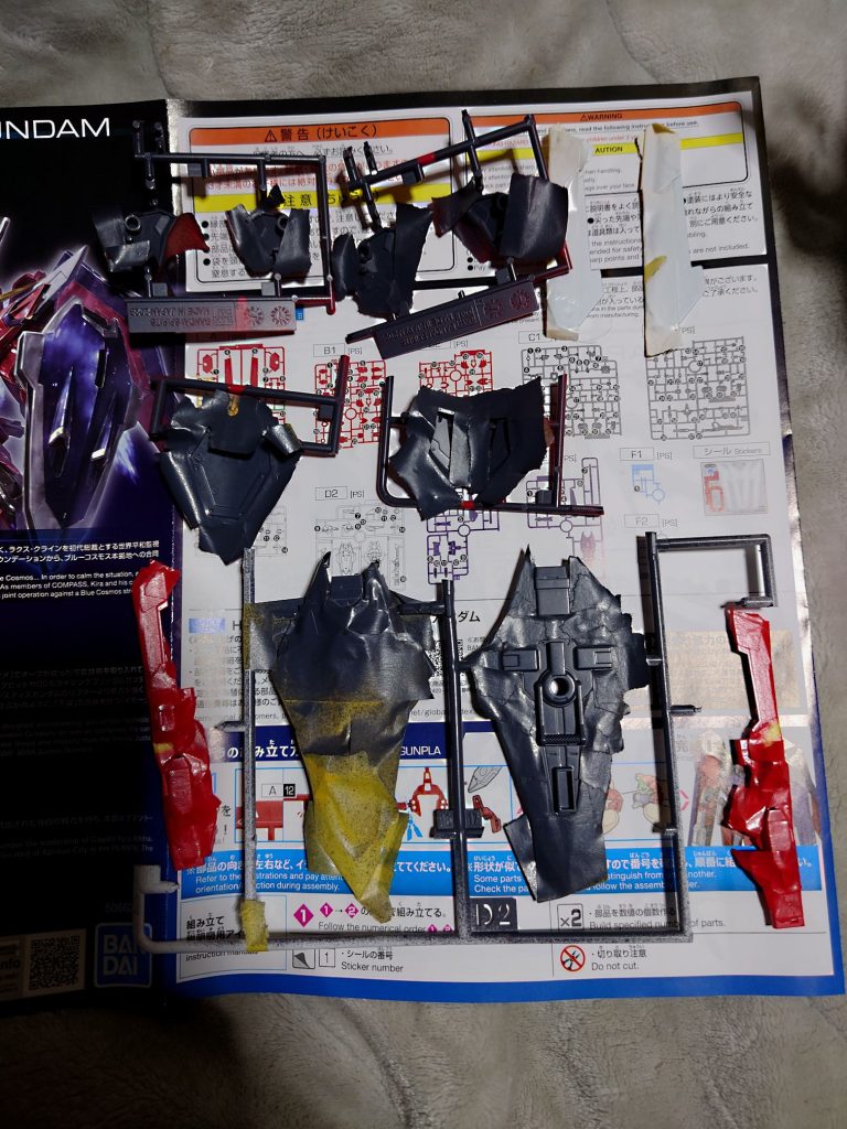 私なりにパーツ裏を塗装すると、普段は見えないけど完成度を高める部分だと思ってます。今回のイモータルジャスティスだと上記のパーツ裏を、完成すると見えなくなる部分が多い物の塗装しました。