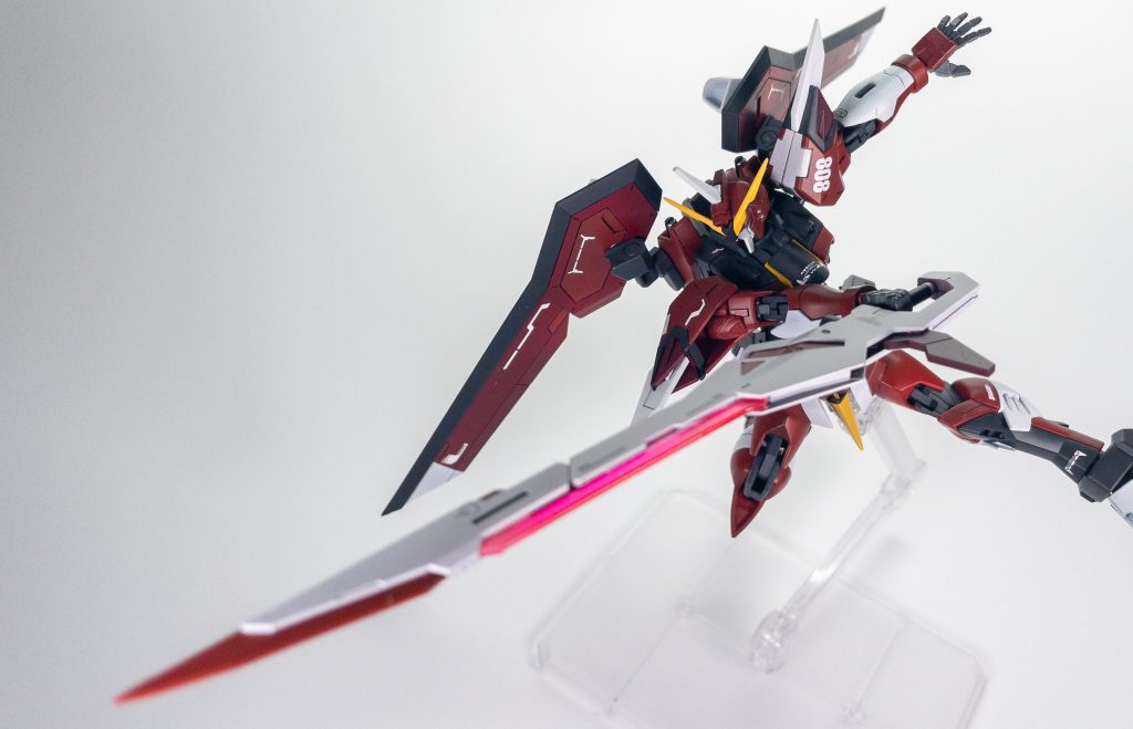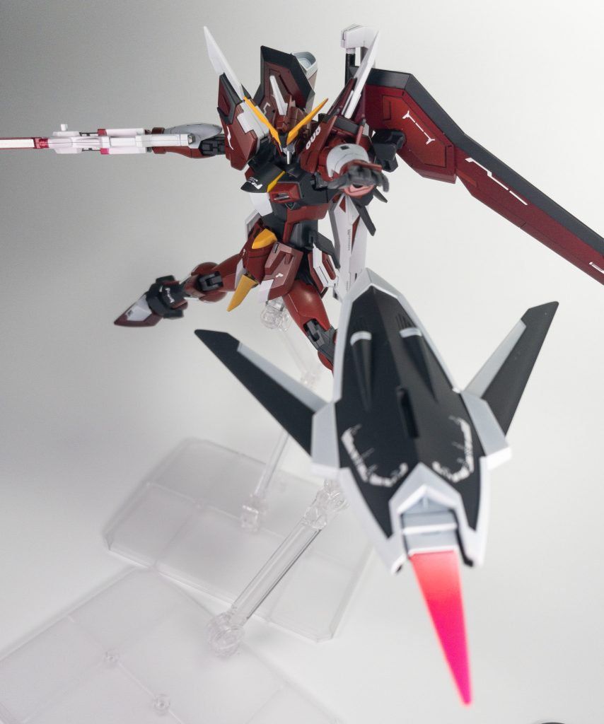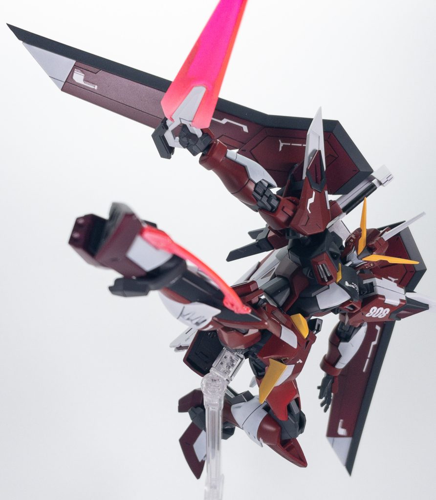 HG イモータルジャスティスガンダムを赤服イメージカラーで全塗装しました。以前制作のライフリと違いプロポーションは弄る必要がないと思いましたので全体的にエッジを意識して今回は制作しました。