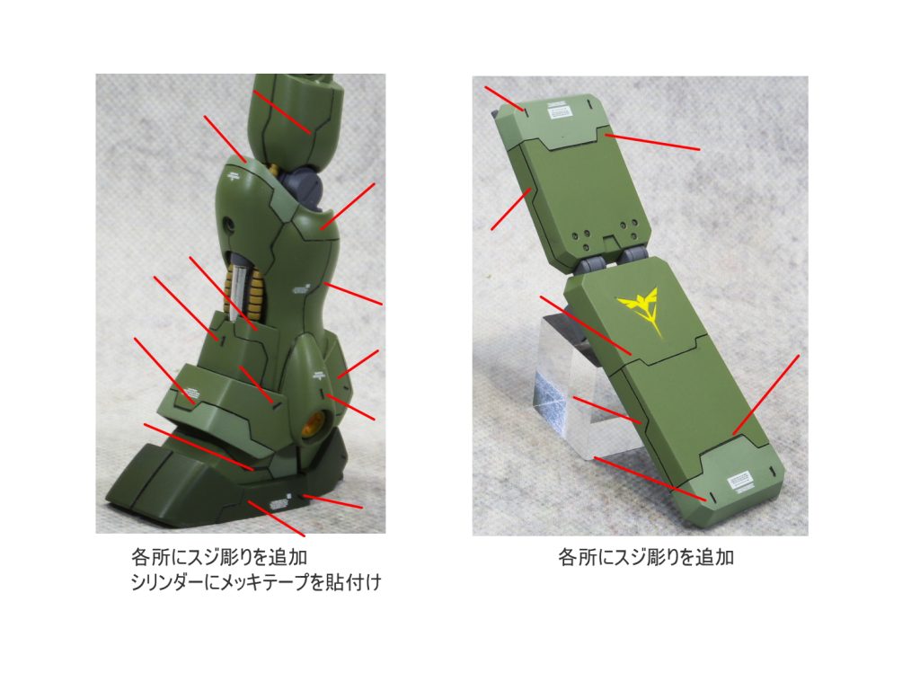 太ももをプラ板にて1mm幅増ししました。 各所にスジ彫りの追…