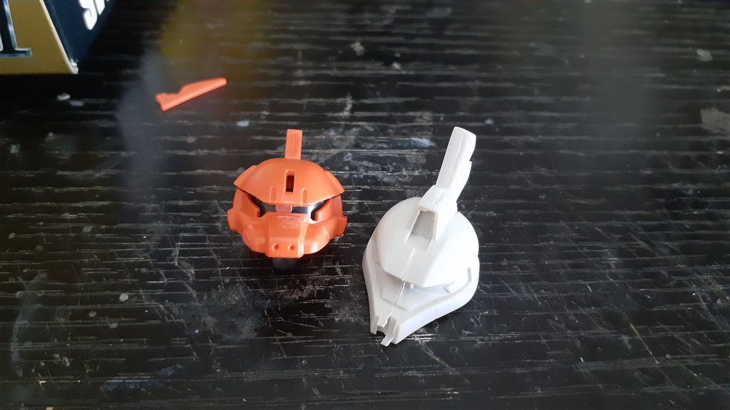 次に、ゲルググキャノンの専用機の画像を散見してきて、通常のゲルググS型の頭部を使っていたので、元のゲルググキャノンの頭部センサーを移植しつつ、ブレードアンテナを横に付けることで、ほかの作品との差別化を図りました。
