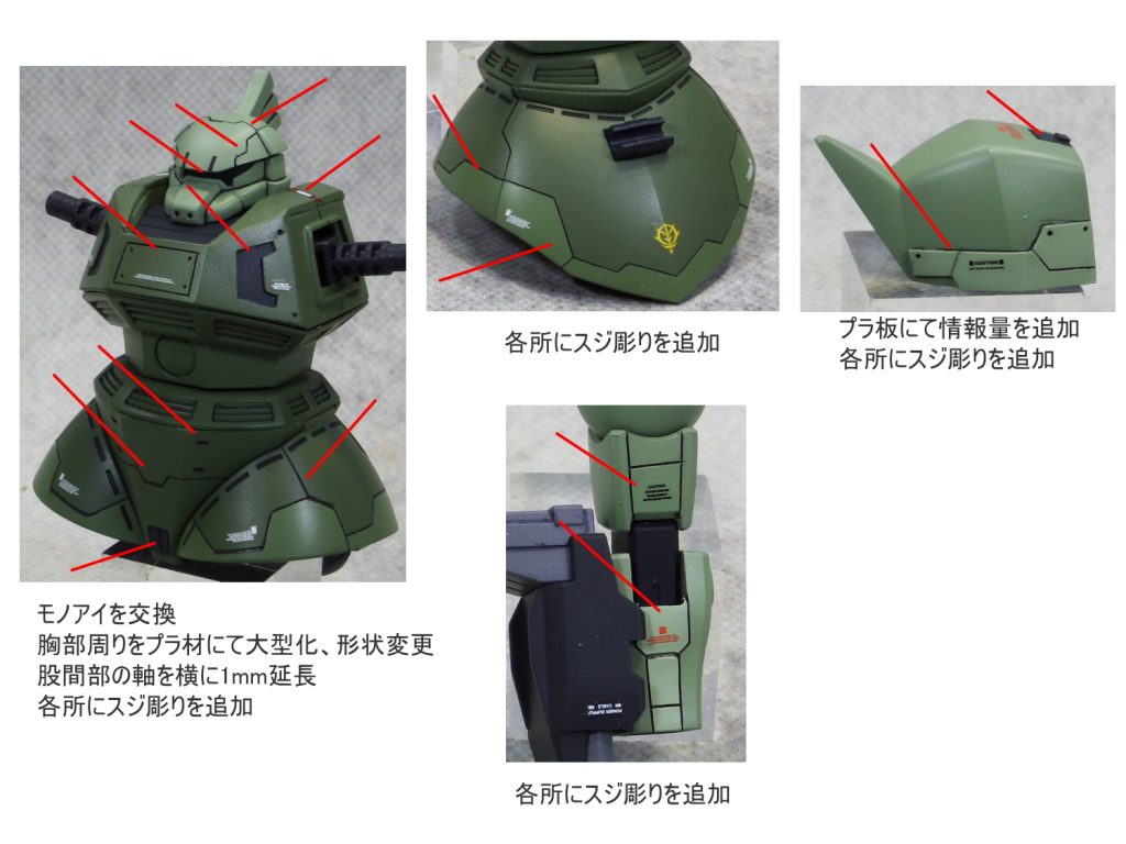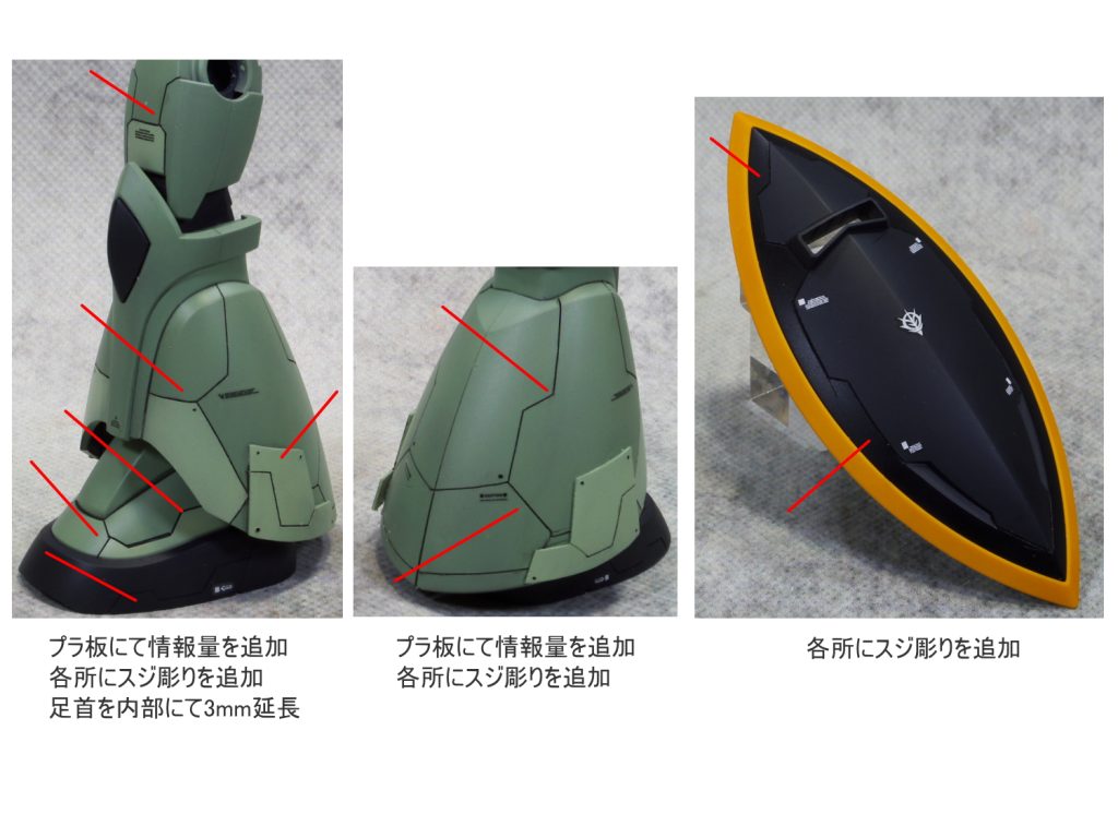 太ももをプラ板にて1mm幅増ししました。 各所にスジ彫りの追…
