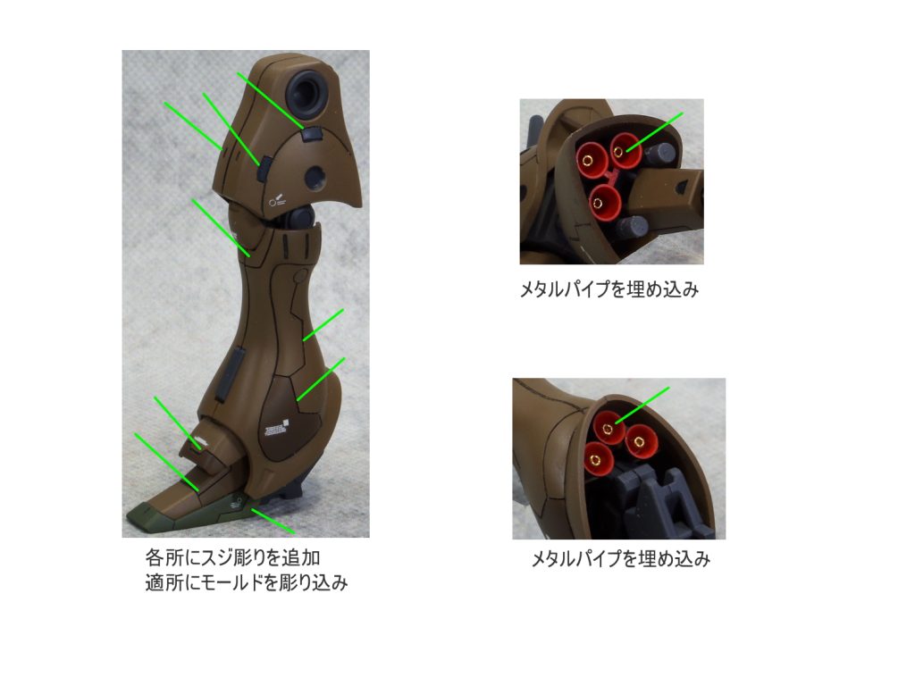 各所にスジボリにて情報量を追加して塗分け 太ももをパテにて幅…