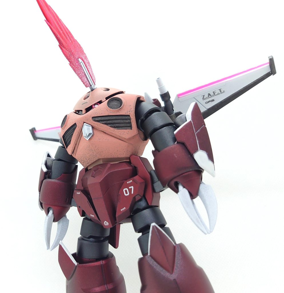 中へジャスティスを仕込むのではなく、純粋にズゴックと向き合って製作しました。大きな改造点としては、腰部パーツの見直し、腕部の巨大化、フェイスリフト、背部リフターの見直しです。