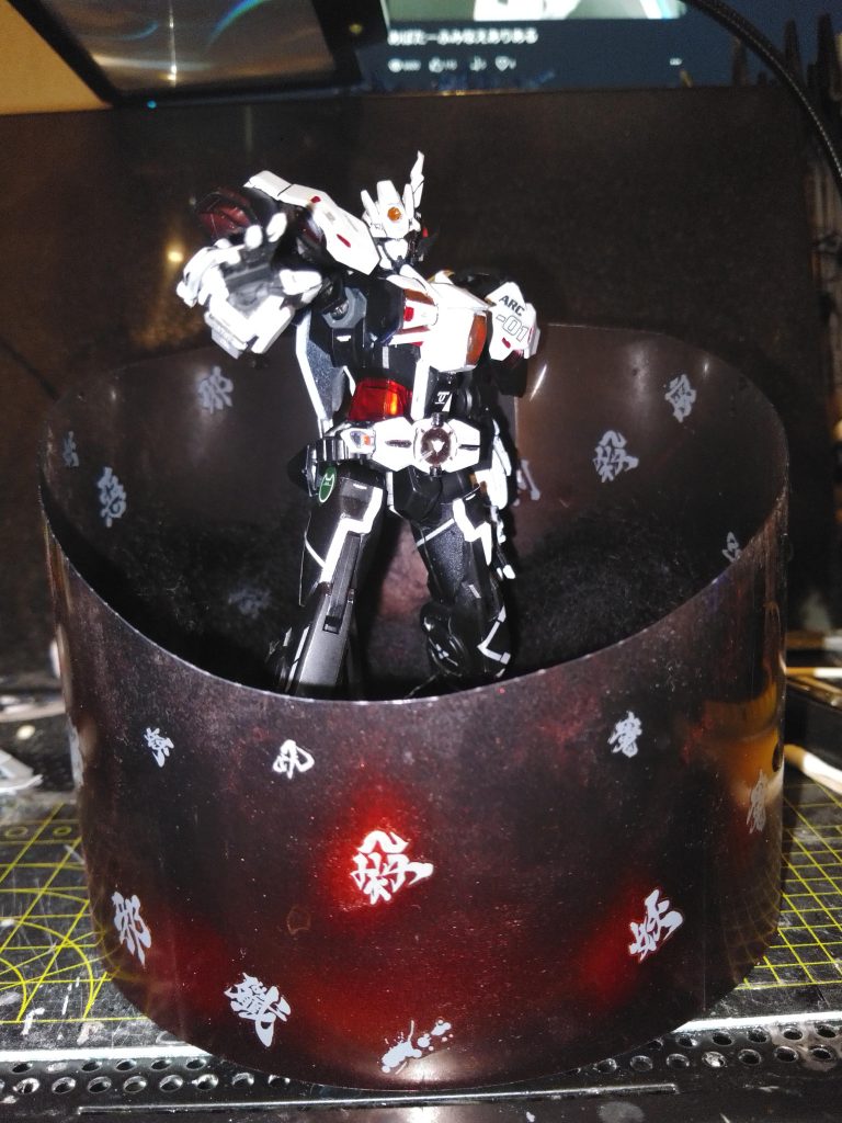 100均製クリアファイルをカットして丸めて黒サフとガンマカロイヤルメタレッドを吹いたモノにGMデカールの妖魔調伏をペタペタと。