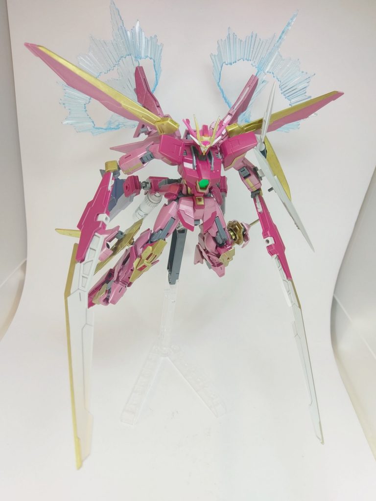 足はダブルオースカイとシャイニングブレイクを組み合わせ、ヴィダールのスラスターとトールギスⅡ(旧キット)のスラスターを組み合わせて追加してます。頭部はダブルオースカイのものにインパルスのものをくっつけてます。