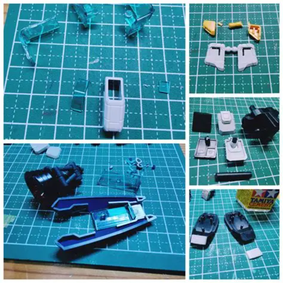 換装したパーツの足りない部分を、ランナーのクリアパーツ部分を加工してハメたり、他の余剰パーツを接着したりしております。