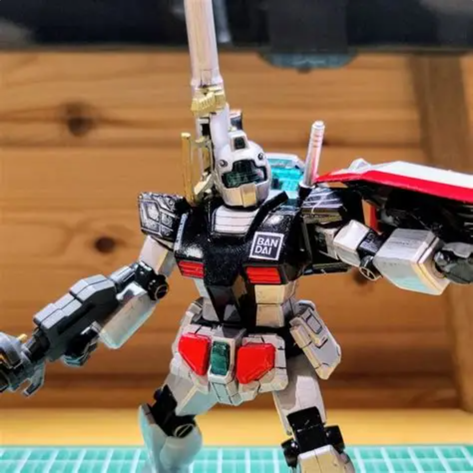 ガンダムベースで買ってきた、真っ黒なエコプラHGジムの各所を最終決戦仕様的に改造し、今回もガンダムマーカーだけで仕上げました。