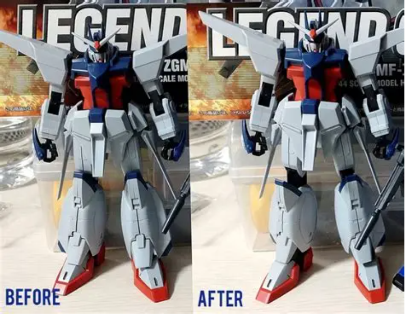 脚の形状がボッテリしているので、膝関節が見えるだけでもだいぶ印象が変わりますよね。簡易的な改修でHGCE頭身に近づけたので満足しております。