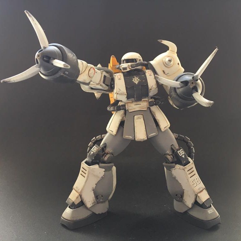 製作はザクマリナーをベースに、ビルダーズパーツ製バックパック、ズゴックの爪をグローブに見立てて装備したミキシングビルドです。