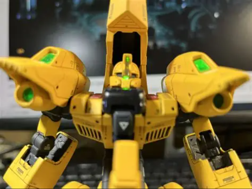 モノアイと頭頂部はLEDユニットを電池ボックスとして使用し、コード付きLEDを半田付けして胸部に内装し、頭部まで配線してあります。