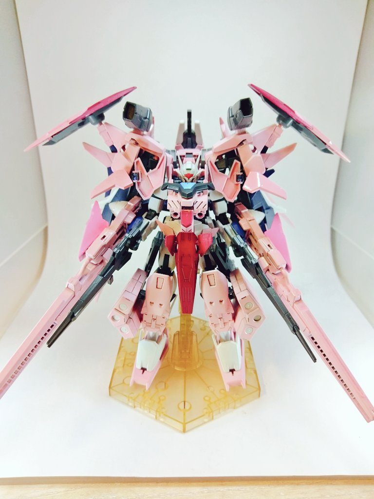 単にダブルオーサクラにスターゲイザーの輪っかを追加しただけですが、夜桜をイメージしています。スターゲイザーで「月」、足首や肩から「桜」、本体から「夜」をイメージしていただければ嬉しいです。このために本体に黒を用いました。
