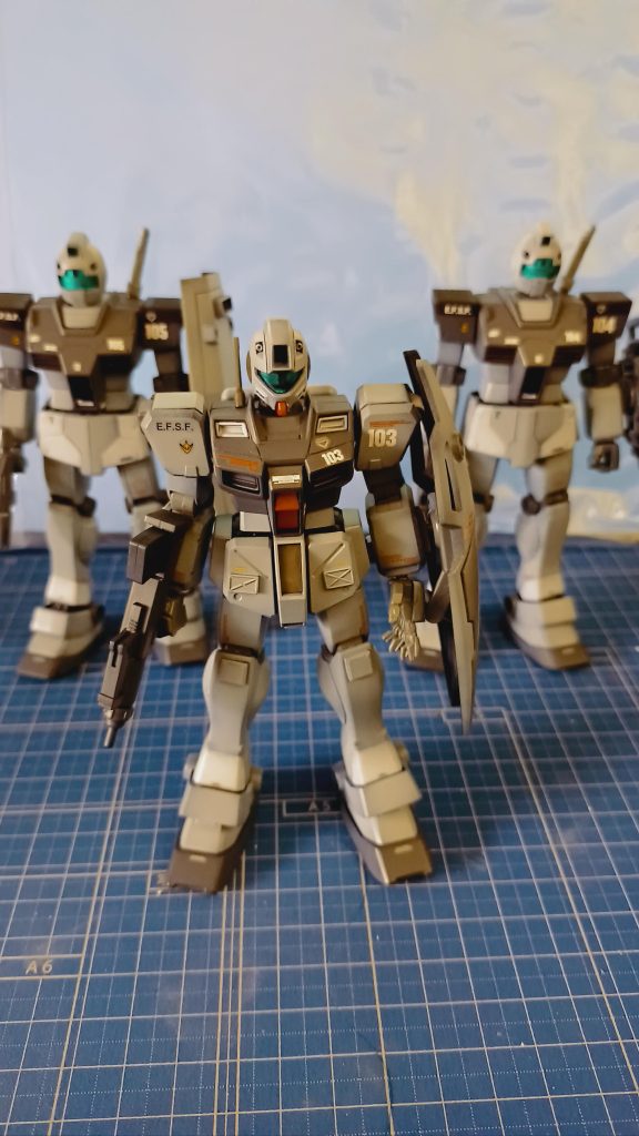 ジムの2機は首部分を延長して顎を引いた状態に出来るように加工し、若干のスジ彫りとシールドの加工、陸ガンシールドの利用等若干手を加えてコマンドと同じ配色でカラーリングしました。
