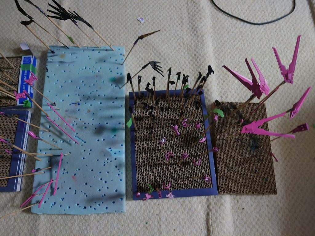 下地を灰サフからのMrカラーピンクで施した後にムーンストーンパール・GXホワイトシルバー・ホワイトの混合でグラデ塗装。仕上げはつや消し。