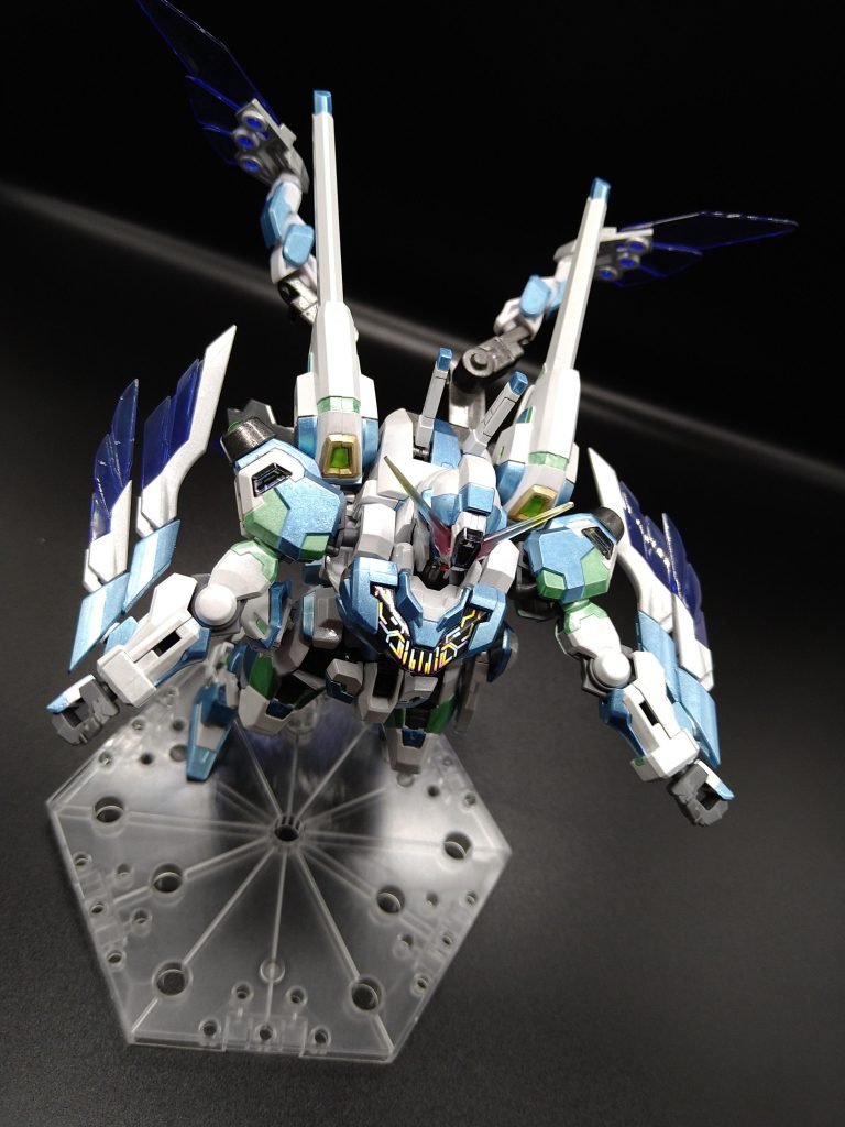 今回は機体に羽を付けてみた所、メインウェポンのロッドライフルが動きに干渉してしまい、ライフルを外す羽目になりました…。