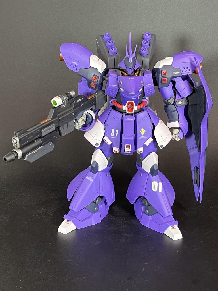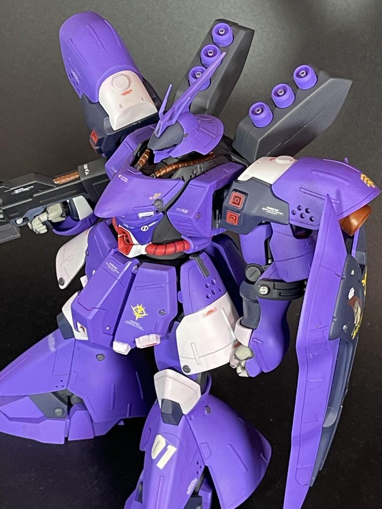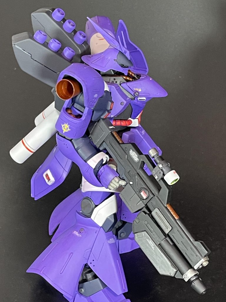 以前シャア専用の赤いサザビーは制作したので今回はオリジナルカラーで塗装したバイオレットカラーのサザビーです。改修ポイントは全体的にスジボリ等のディテールアップして顔を少し奥にハマるように削り。各部にあるバルジは削ってエバーグリーンのプラ材で作り直し。パテとブラバンで胸はナイチンゲール風にボリュームアップ。腿も細いのでエポキシパテでボリュームアップ。肩内部にアドラーズネストのアルミ製のバーニアを取り付けて、ハンドはHDMのハンドに交換しました。ビームショットライフルはボリュームが足りない感じがするのでジャンクパーツとプラパイプでスコープセンサーをスクラッチ、ガンダム03Sステイメンのバズーカの弾倉を加工した物を取りつけてグレネードランチャーとして工作してみました。