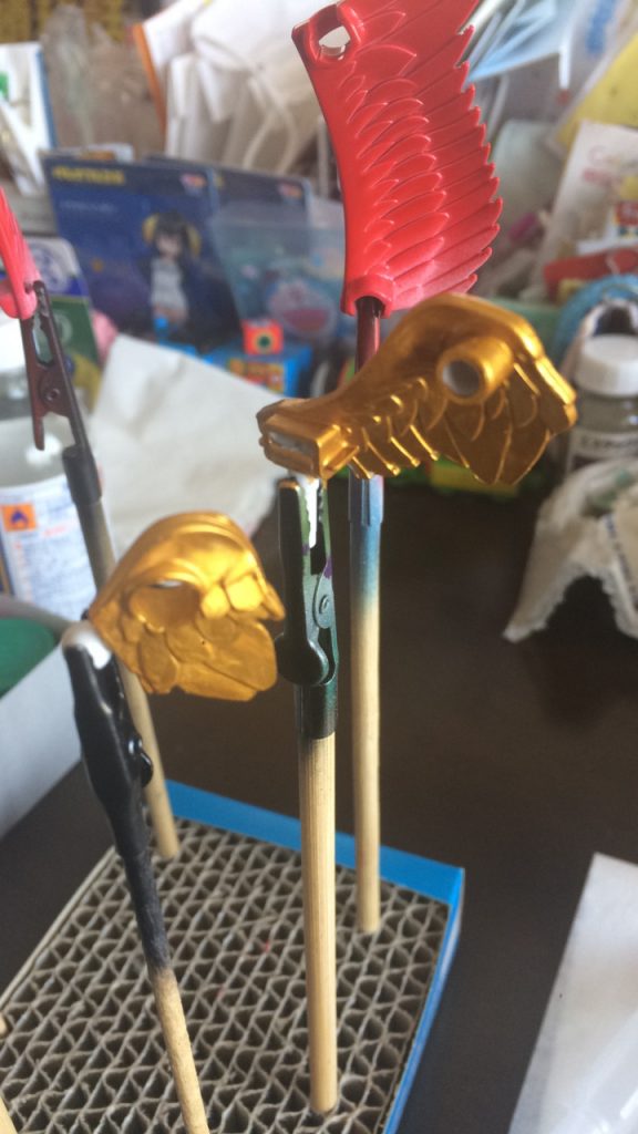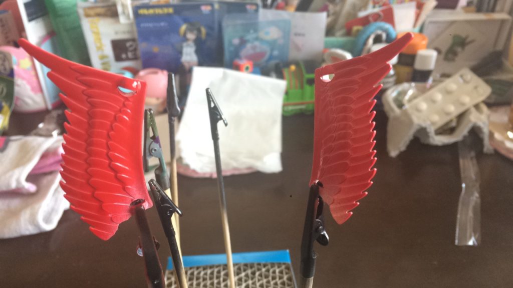 筆塗りでは筆ムラが目立ちがちですが、あえて羽根の質感を出すためにあまり薄めずに塗ってます。
