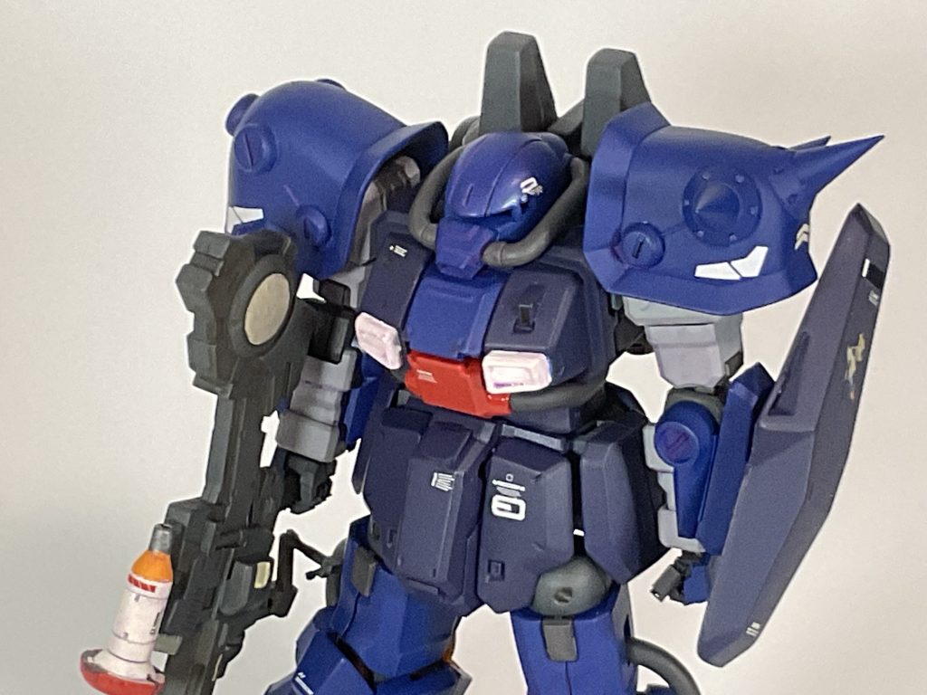 HGUCホビーハイザックをベースにしたニューディサイズ所属機のハイザックが完成しました。改修箇所はシールドとバックパックをハイザックから流用、ショルダーのスパイクをアドラーズネストのアルミ製スパイクに交換して胴体の厚さをプラ板で1.2ミリボリュームアップ。シールドと左腕にネオジム磁石を埋め込みんで接続。モノアイはハイキューパーツに変更しました