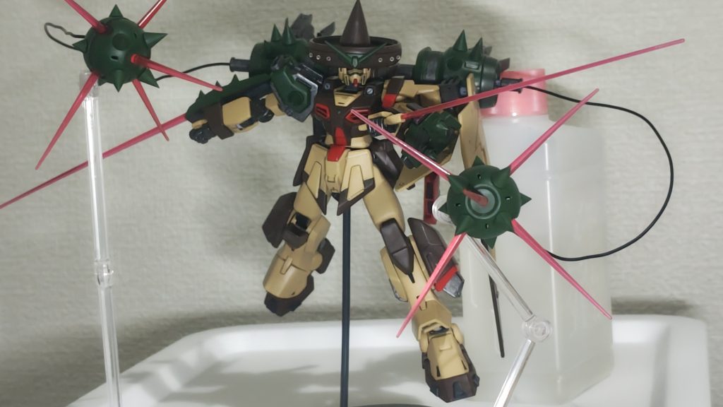 テキーラガンダムの腕と右肩のサボテン要素(トゲ)を控えめにして、代わりにバックパックにトゲを沢山つけてサボテンぽくしてみました。ガトリング砲は上部に持ってくることで対空砲撃が可能。