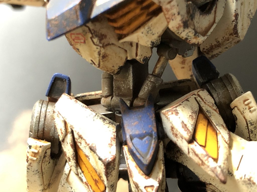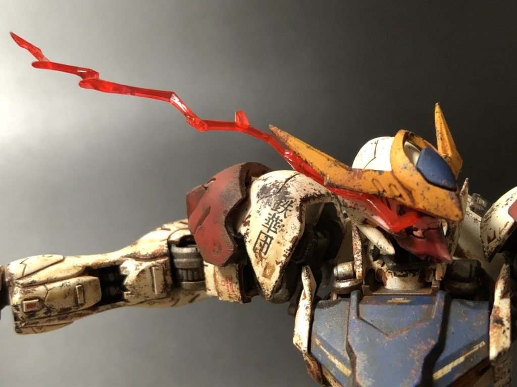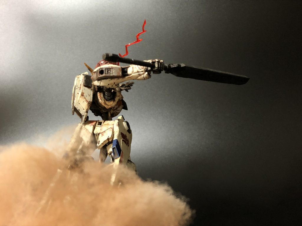 作ってる途中で思いついて砂煙の中にモデリングペーストを固めて細かく砕いた物を散りばめてバルバトスが動いた際に蹴り上げた石や土の塊を表現してみました