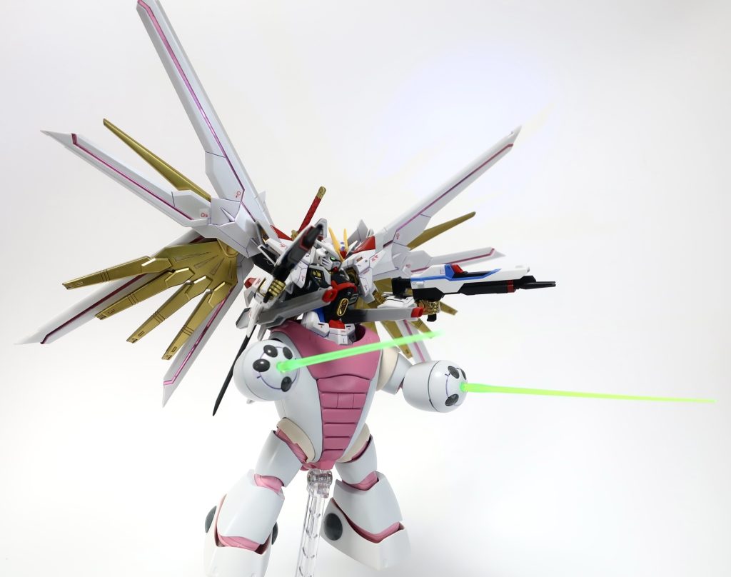 どうしても収納しきれなかったストフリの肩が露出してるけど、ズゴックのアンテナみたいな感じが出て結果オーライ。関節がちょうどピンク色だったのでラクス色に染めました
