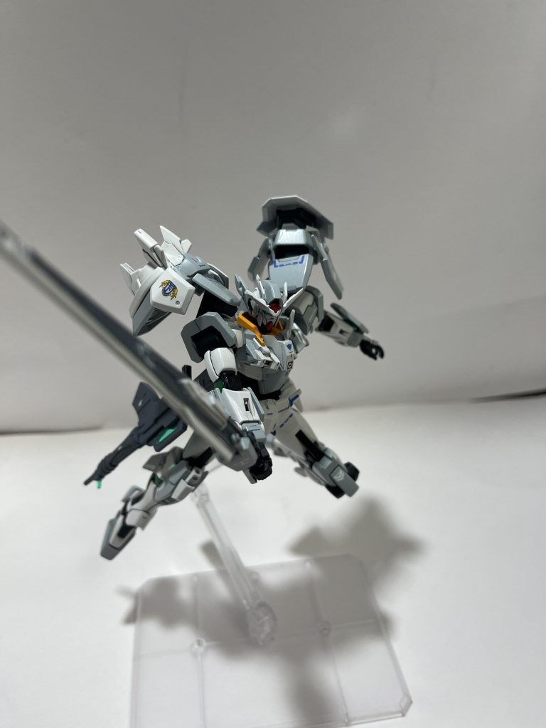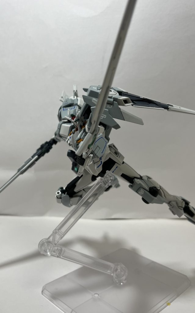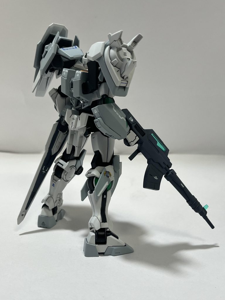 今回は資金難という状況下で完成した設定のプロトタイプの制作なのでソレスタルビーイングから回収したダブルオーガンダムの予備パーツや、一部新規製造のパーツで組み上がった設定です。また、カラーリングは0ガンダム、アストレアⅡ、刹那の受領前のエクシアを意識していて、いい感じに試作機感が出せたんじゃないかなーと思います。