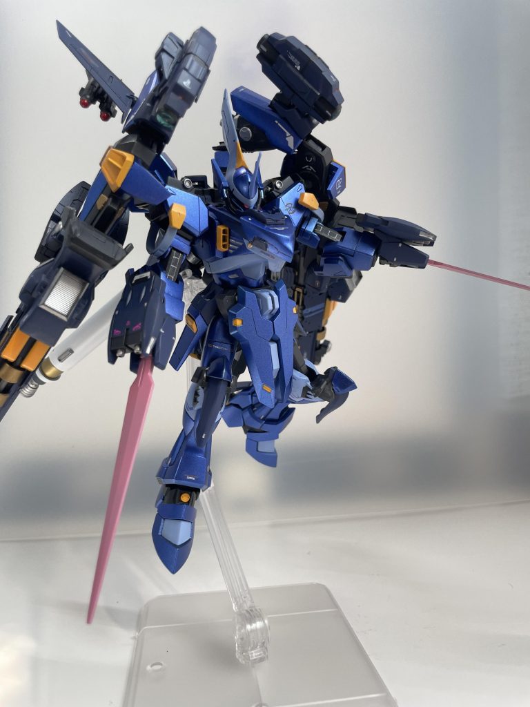 パイロットのシホ・ハーネンフースの影響でしょうか。出来るだけ本体は女性のような丸みを帯びるようにし、武器はデカく直線を意識してメリハリを狙いました。パーソナルマークのホウセンカの花はめちゃ悩みましたが自分用なので辞めときました。