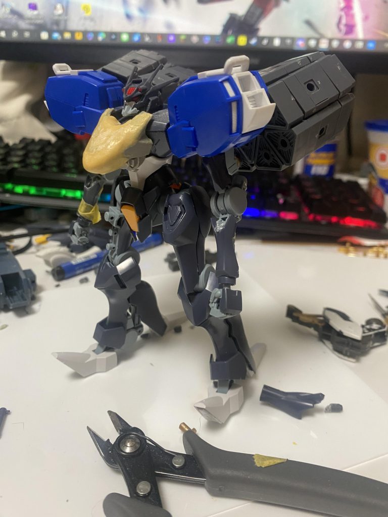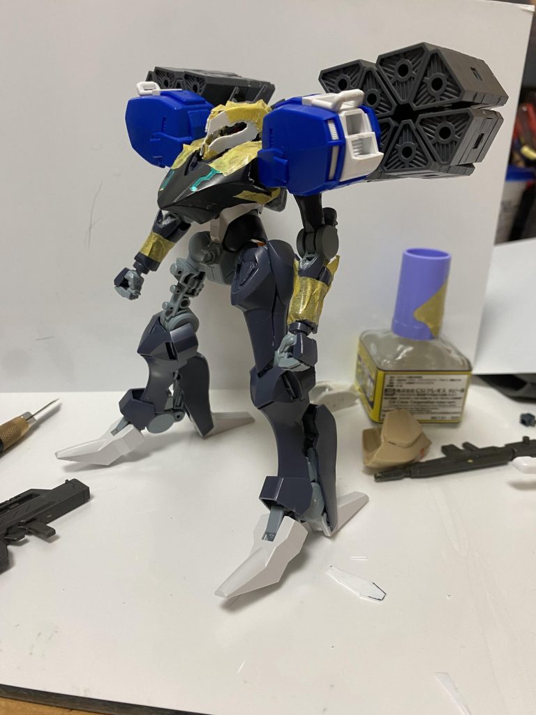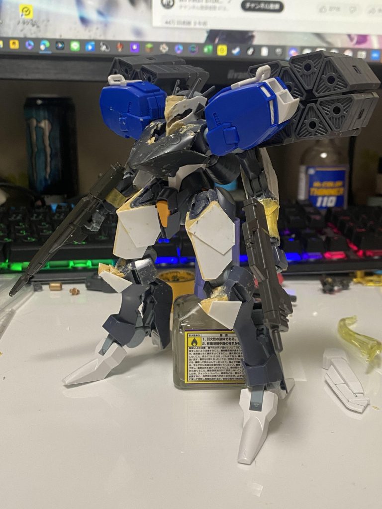 まず腕を延長、方はsガンダムを使用し、フロントはLBXベクターを使用し、バックパックにはMSGのマルチミサイルポッドを8×2個連結し取り付けました。パテを使い始めてまだ日が浅いことと久しぶりの制作だったので荒いところも多いのでその辺は気にしないでいただきたいです。