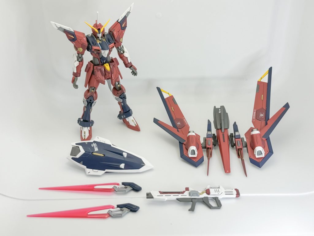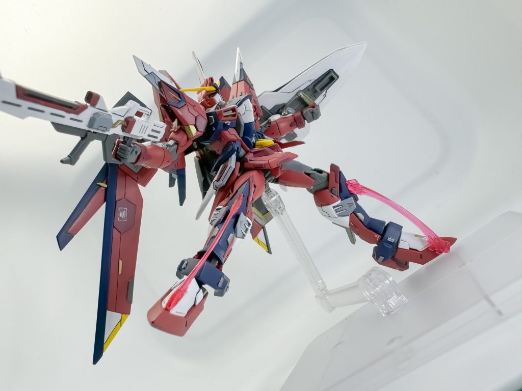 イモータルジャスティスの初期構想型をイメージして作成しました。映画本編前の新型構想の際の機体として、各種武装の試験をしていたと言う設定です。プラモの作りとしては、各種シャープ化、パーツ延長、プラ板やスジボリでディテールアップを施しています。塗装は、筆塗り全塗装になります。