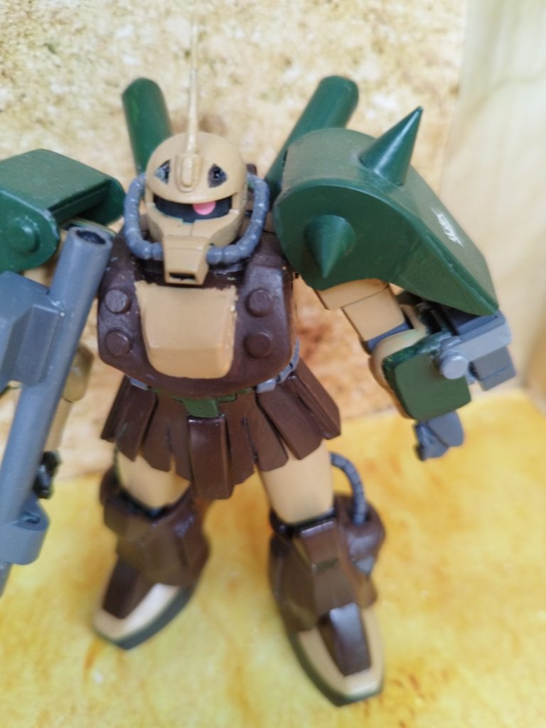 ガンダムUCに登場したディザートザク(カトキさん版)を自作しました約3年くらい前にガンプラに復帰した時に2番目に大改造したモノです。手を入れてないのは太ももくらいです。塗装は当時エアブラシもないので全部筆塗りです。ロケットランチャーは、旧キットディザートザクから持ってきました。これは縁があってマァマァ安く手に入った物からパクりました。本体は作成済みで別途掲載予定です。塗装レシピは覚えていません。ウッドブラウンとサンドブラウンあたりだったと思います。手探りでトリントン基地のシーンを繰り返し見つつ、ホームページの掲載画像を見つつ、という、気合いだけで作りました。当時は旧キットも持ってなかったので、ミキシングなんて当然出来ず、だけど、旧キットがないおかげで、割と旧キットより、カトキさん設定画に近づけられたと思います。旧キットがなかなかの特急呪物なので、HGUCスタイルからの改造のほうが、アニメに近いと思ってます。HGUCはリバイブ版じゃない方から作ってます。作品が荒いのは理解して掲載してるので、腕が上がったらVer2.0として掲載するつもりでいます。いつになるかはわかりませんが。