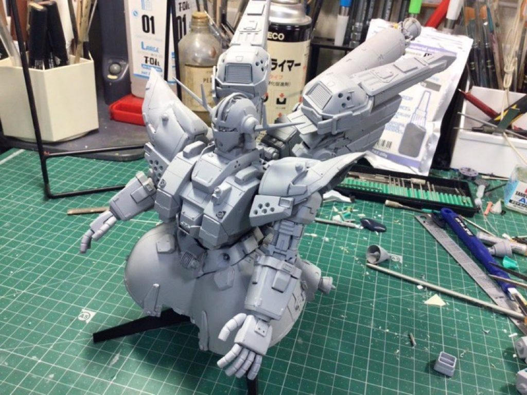 HGジオングを改造して高機動型ジオングをオリジナルなアレンジをして製作しました、キットのままだとスカートとショルダーがボリューム不足なポイントを主に改造しました。改造箇所はスカートとショルダーアーマーをエポパテとプラバンで大型化、ドーベンウルフの肩パーツにブチ穴を開けてショルダーアーマーに取り付けました。頭部内部にモノアイレールをプラ板積層でスクラッチ、モノアイはハイキューパーツの物に交換、胸部はパーフェクトガンダムの胸部を使いボリュームアップ。スカート内部はジャンクパーツを使ってゴチャメカ化、バーニアにアルパアジールのファンネルを使ってディテールアップ。背部の高機動バックパックはMGシナンジュやギャプランのキットを使って製作、バーニアは市販のアルミパーツを使い、ブースター部分はハイゴッグのミサイルカバー、機体各所にジャンクパーツやエバーグリーンのプラ材やスジボリをしてディテールアップ。塗装はラッカー系のエアブラシで行いました。
