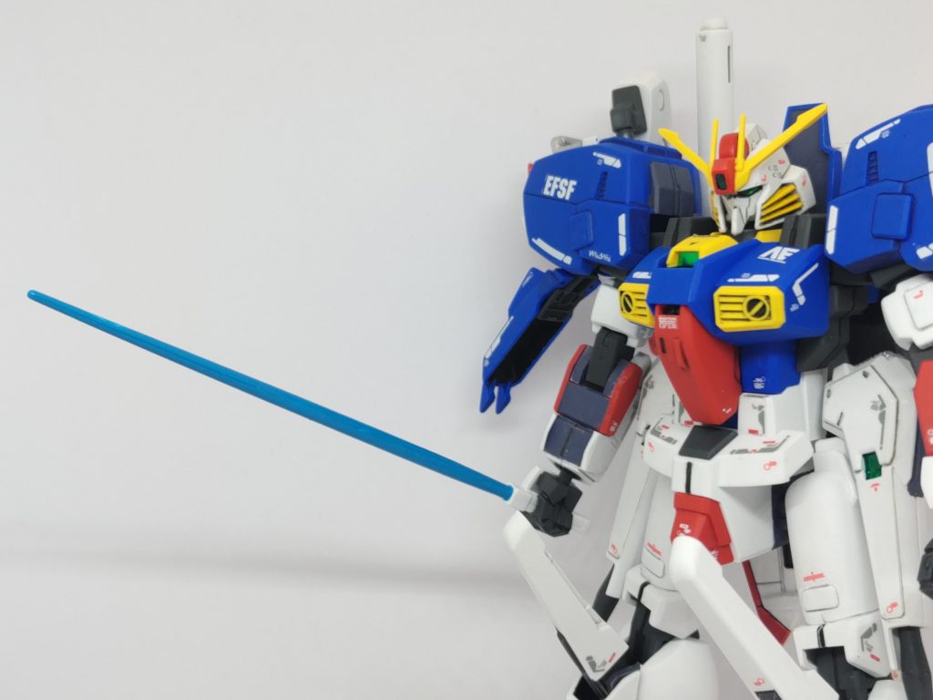 聞きしに勝る全身の合わせ目でしたが幸い白いパーツに合わせ目が多いのでキレイに消えてくれました。肩アーマー、脇腹、腰部ビームキャノンは段落ち化。